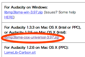 - Lame MP3 Encoder Binariesから「libmp3lame (For Audacity 1.3.3 on Mac OS X)」をダウンロードします。