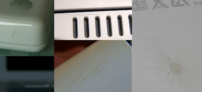 ひび割れしやすいと認められたのは、トラックパッド周りのパームレストの他に、後部の換気口周り(ヒンジも含む?)、背面のコーナー、I/Oポート周りなど。
