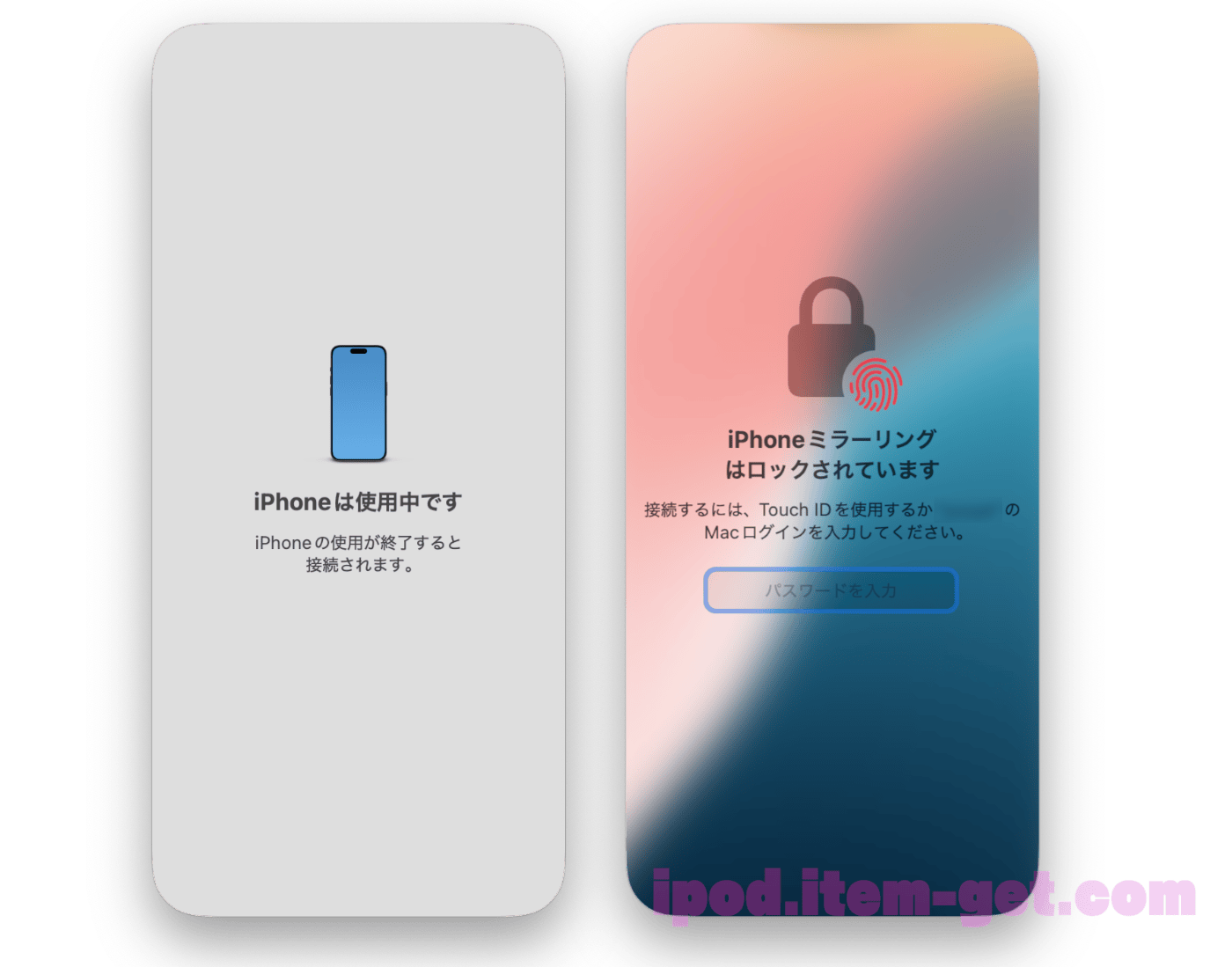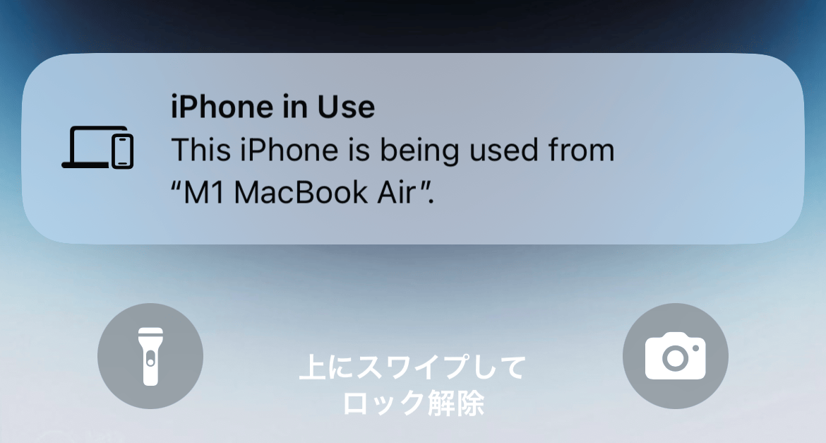 ミラーリング中は、iPhoneのロック画面に「このiPhoneはMacで使用中です」という表示が出ます。